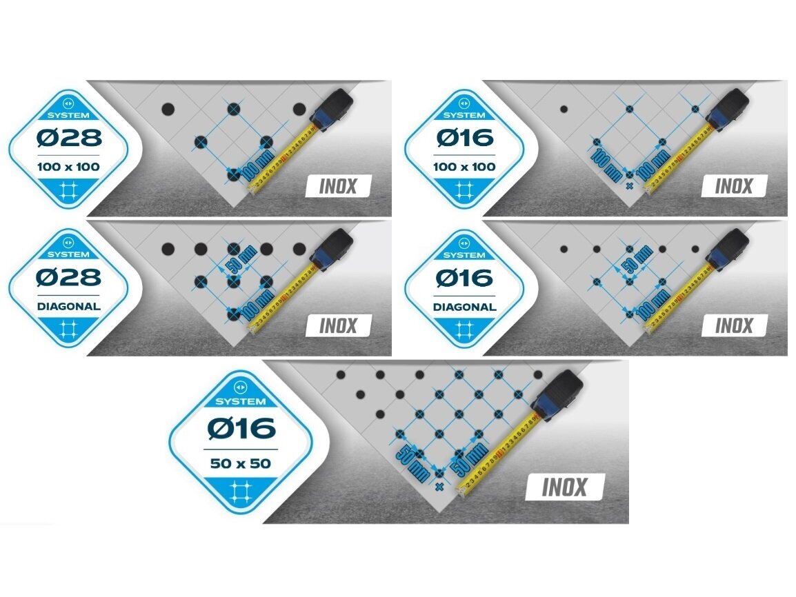 ТРИ РЯДИ ОТВОРІВ У БІЧНИХ ПАНЕЛЯХ Розташування у шахматному порядку по всьому периметру столу дозволяє більше варіантів кріплення оснастки |