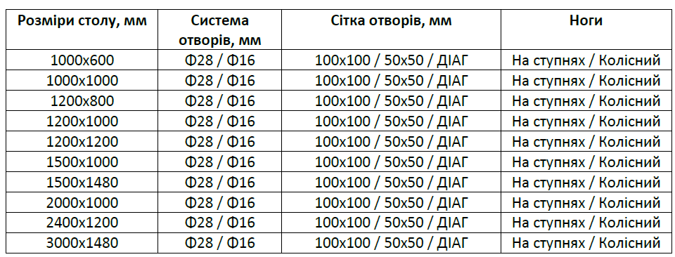 Товщина стільниці 12 мм та ребра жорсткості по всій площі під стільницею запобігають прогину і деформації, а допуск площинності ±0,3 мм забезпечує ідеально рівну і стабільну основу для заготовок. На вибір пропонується 10 варіантів розмірів стільниці. Фрезеровані, скошені отвори з допуском ±0,5 мм та гравірована або діагональна сітка 100х100 мм забезпечують високу точність і якість робіт. Цей нержавіючий зварювальний стіл оснащений ніжками з профілю 80х80х4 мм з вантажопідйомністю 500 кг/ніжка. В залежності від потреб виробництва, можна вибрати ніжки зі ступнею або на колесах.